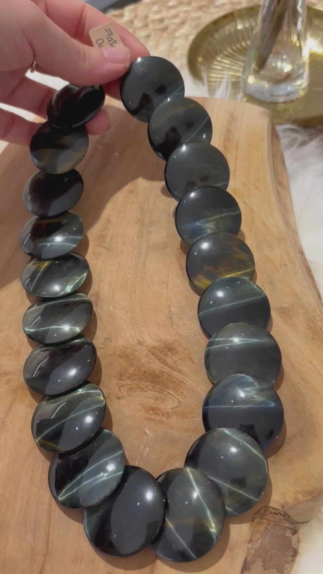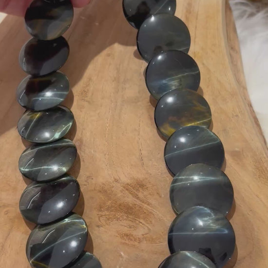 Herrlich schimmernde Falkenauge-Linsen, 3cm Durchmesser, 45 cm lang, mit Echt-Silberverschluss.