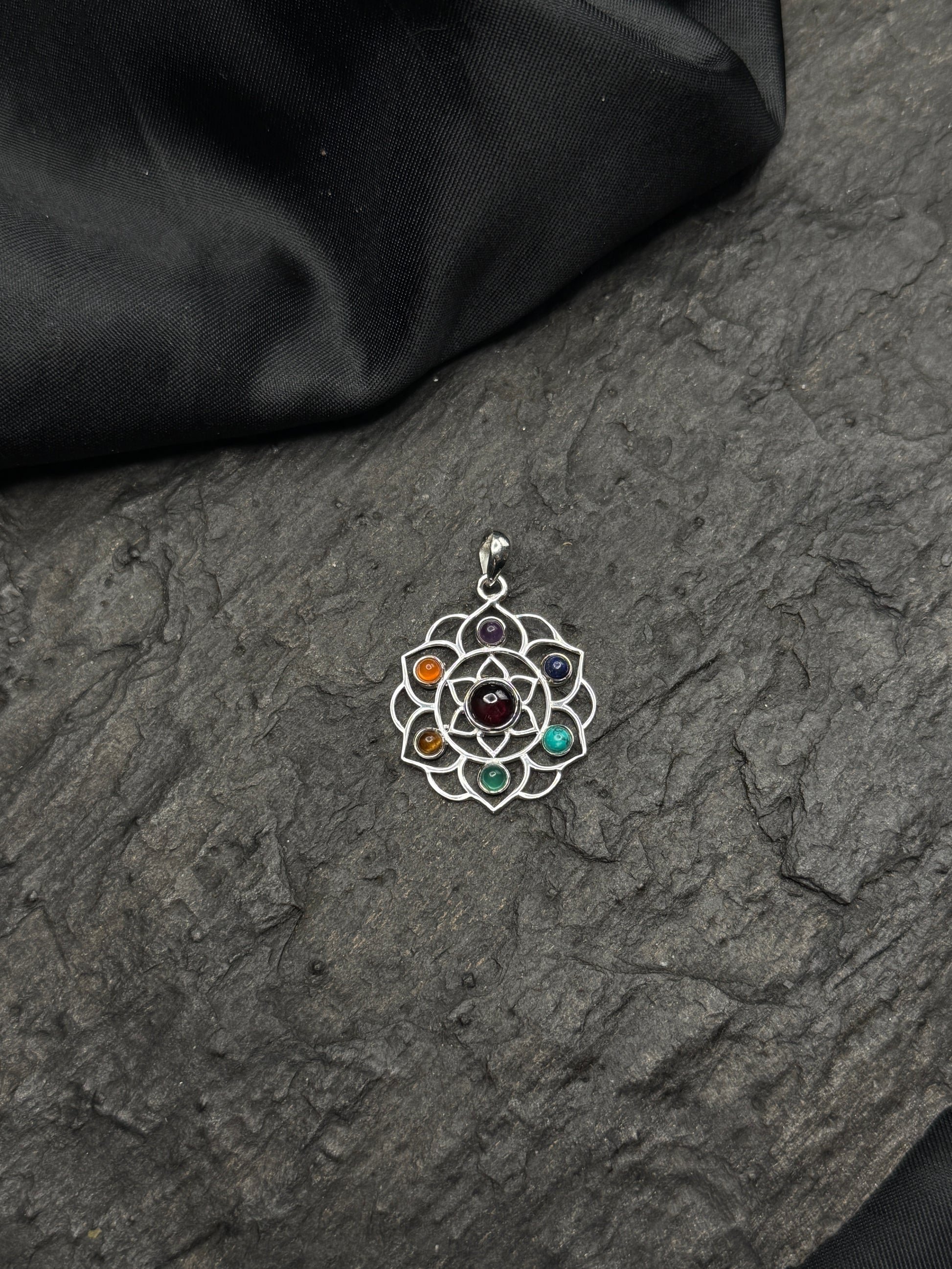 Ausgefallener Anhänger aus 925er Silber mit sieben, verschieden farbigen, Steinen und der Chakrenfigur in Silber. Er besteht aus einem Türkis, einem Carneol Cabochon, einem Granat, einem Citrin, einem, einem Lapis, einem Tigerauge und einem grünen Achat. Jeder Stein ist ca. 3 mm groß.