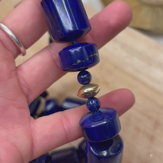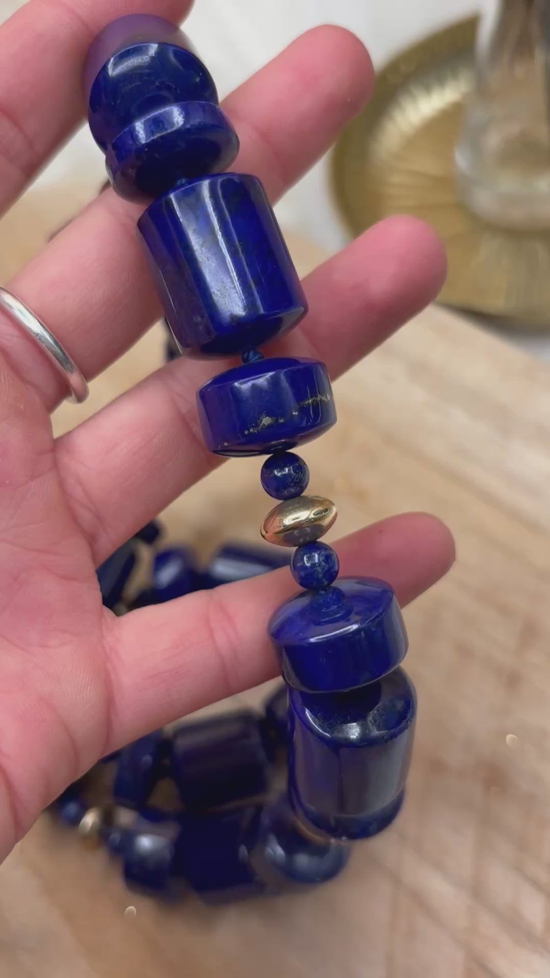 Besondere Kette aus Afghanistan-Lapis. Die Kette besteht aus Rondellen (16x22 mm) und Button (5x16 mm) aus Lapis. Die Zwischenteile und der Verschluss sind Silber vergoldet. Gesamtlänge der Kette ca. 45 cm