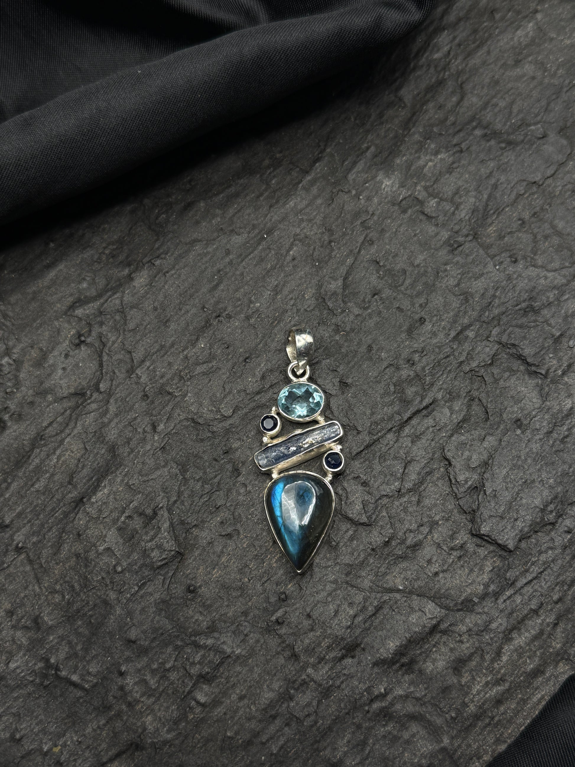 Ausgefallener, mehrteiliger Anhänger aus 925er Silber mit einem Labradorit Tropfen, Cabochon und 18x14 mm groß, einem bläulichen, rechteckigen Disthen und einem facettierten Topas 10mm Durchmesser