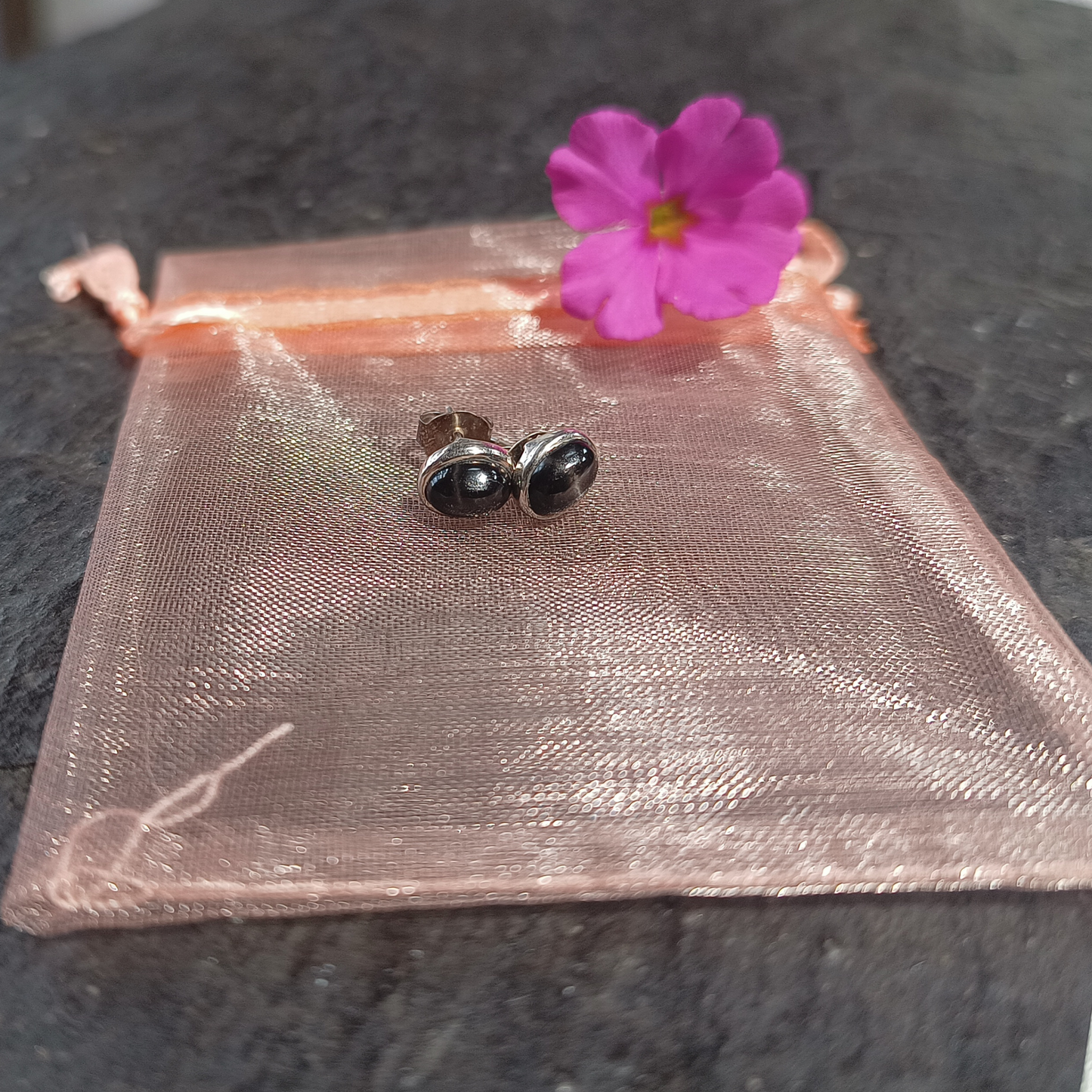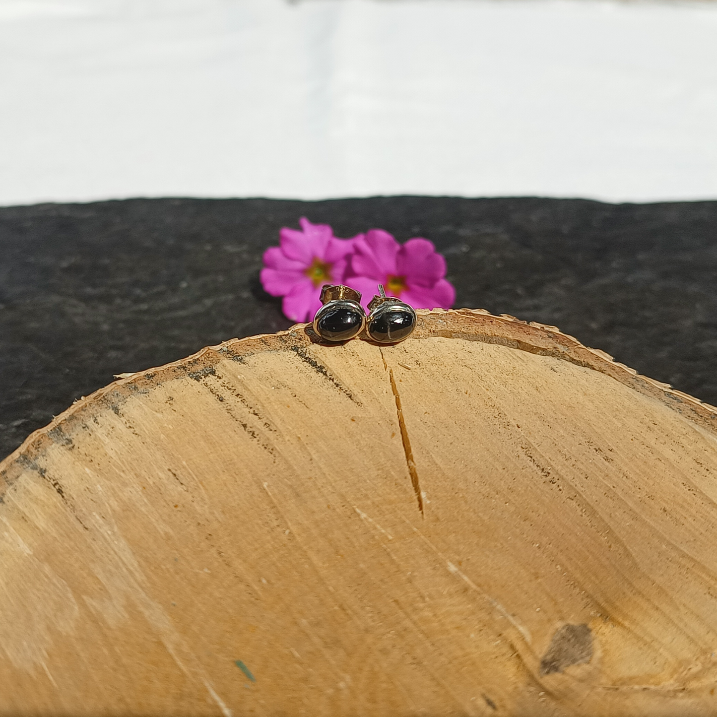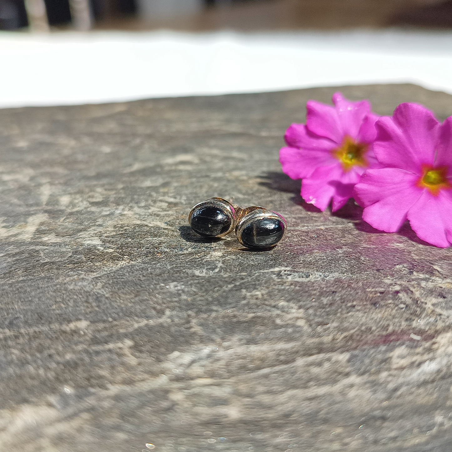 Bezaubernde, kleine Ohrstecker, mit ovalen, schwarzen Obsidian Cabochon mit Katzenaugeneffekt. Die Steine sind 5x7mm groß und in 925-Silber gefasst.