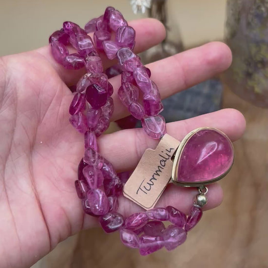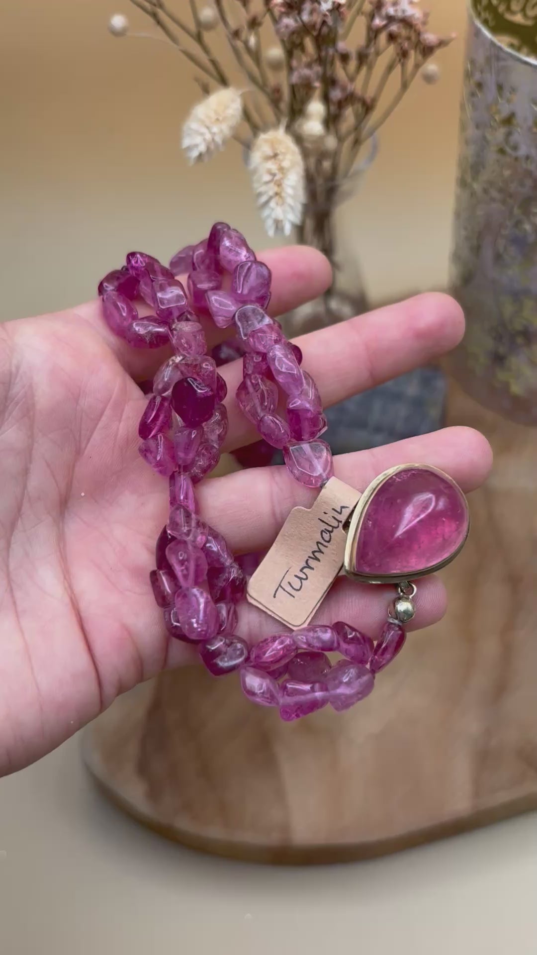 Einzigartige, geflochtene, dunkel rosa Rubellit-Kette. Dreifach, 55 cm, mit traumhaftem 24 Karat Goldverschluss, auf dem ein 3cm großer, geschliffener Rubellit-Cabochon (roter Turmalin) die Aufmerksamkeit auf sich zieht! So etwas gibt es nicht noch einmal!