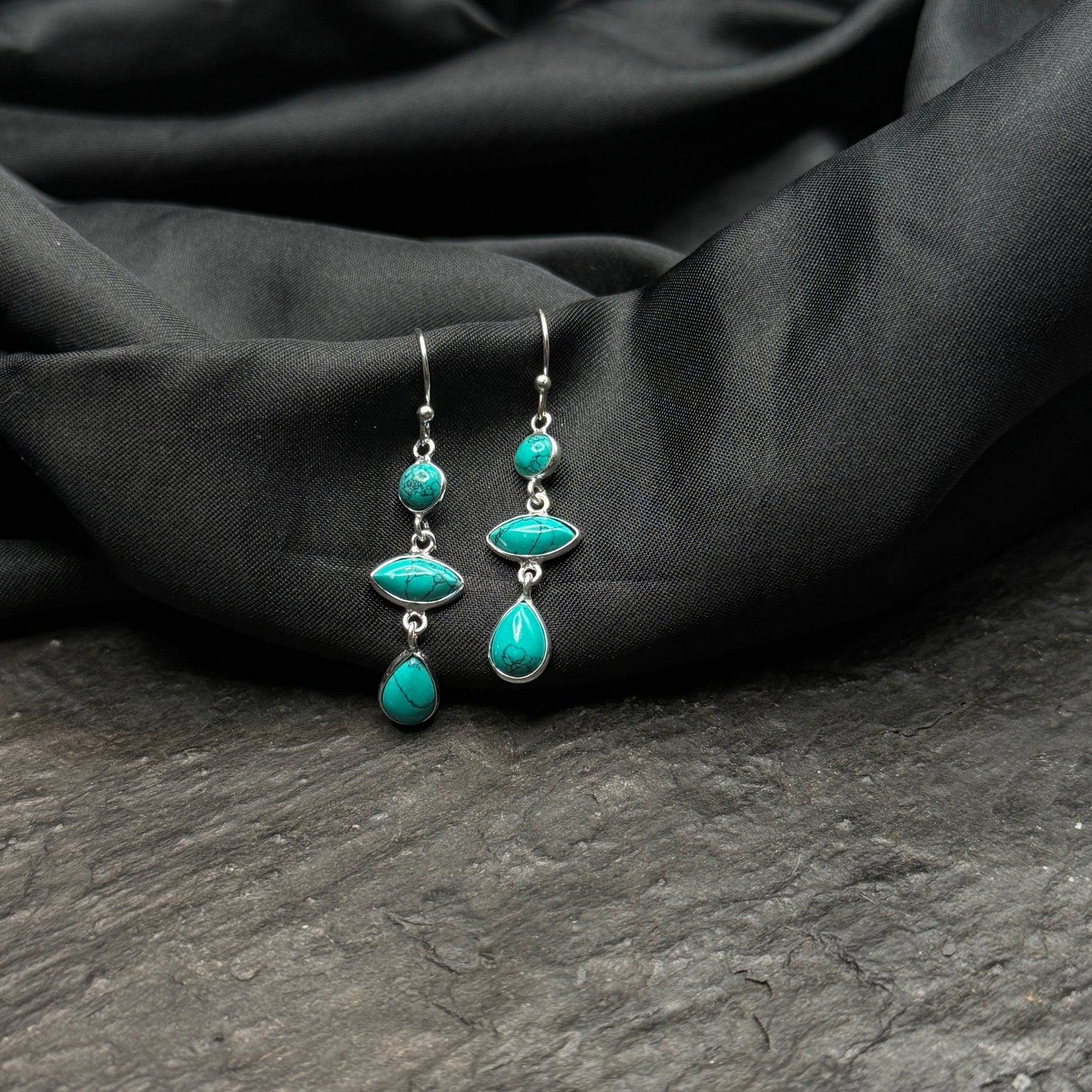 Diese verspielten dreiteiligen Türkis-Ohrhänger in kunstvoller Silberfassung verzaubern mit ihrem einzigartigen Design. Die Kombination aus tropfenförmigen, runden und navette-förmigen Türkisen mit Silberhaken macht sie zu einem außergewöhnlichen Schmuckstück.